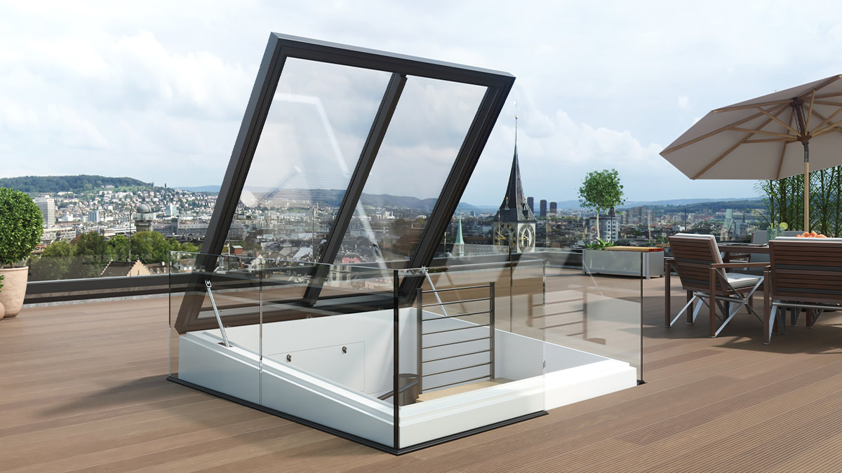 Flachdach Ausstiege der Komfort-Reihe von LAMILUX ermöglichen direkten Zutritt zur Dachterrasse