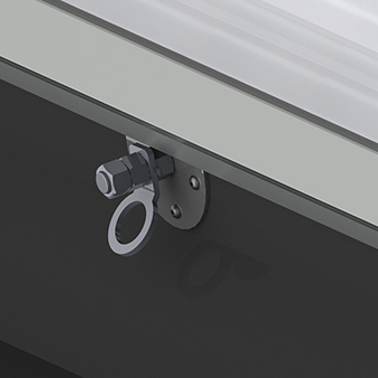 Anschlagpunkt für Personenschutzausrüstung direkt an der LAMILUX Lichtbandzarge – Befestigung für Karabiner mit Auffanggurt (EN 361) und Auffangsystem (EN 363), ausgelegt für bis zu drei Personen