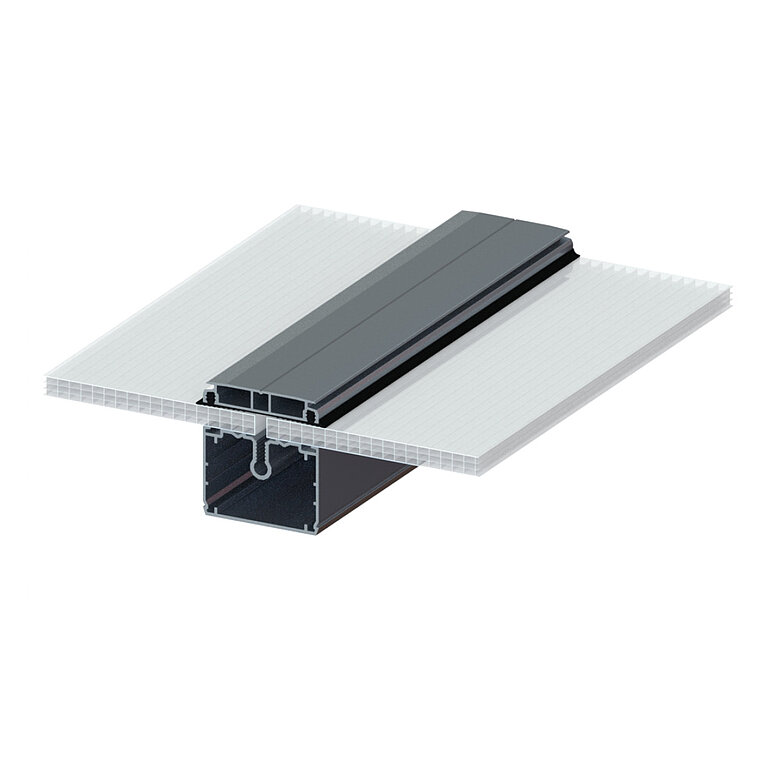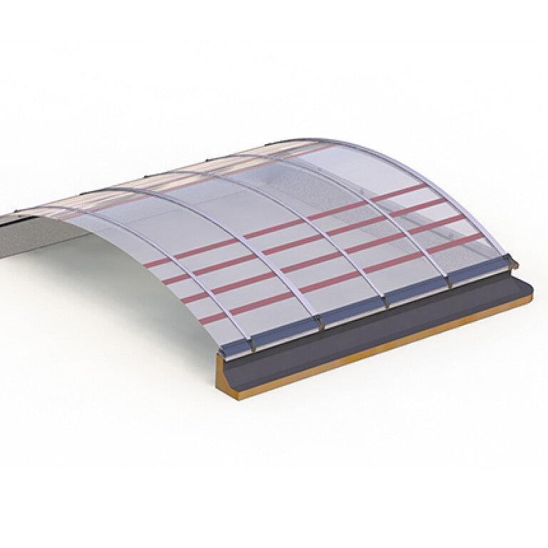 Wirkung: Der Isotherme Lastkonverter (ITL) führt die Traglast des Lichtbandes gezielt in die Unterkonstruktion des Lichtbandes. Da dadurch das Fußprofil von Lasten und Spannungen befreit wird, kann auf metallisches Material verzichtet und für das Fußprofil hochwertiger Kunststoff mit sehr guten Wärmedämmwerten eingesetzt werden.