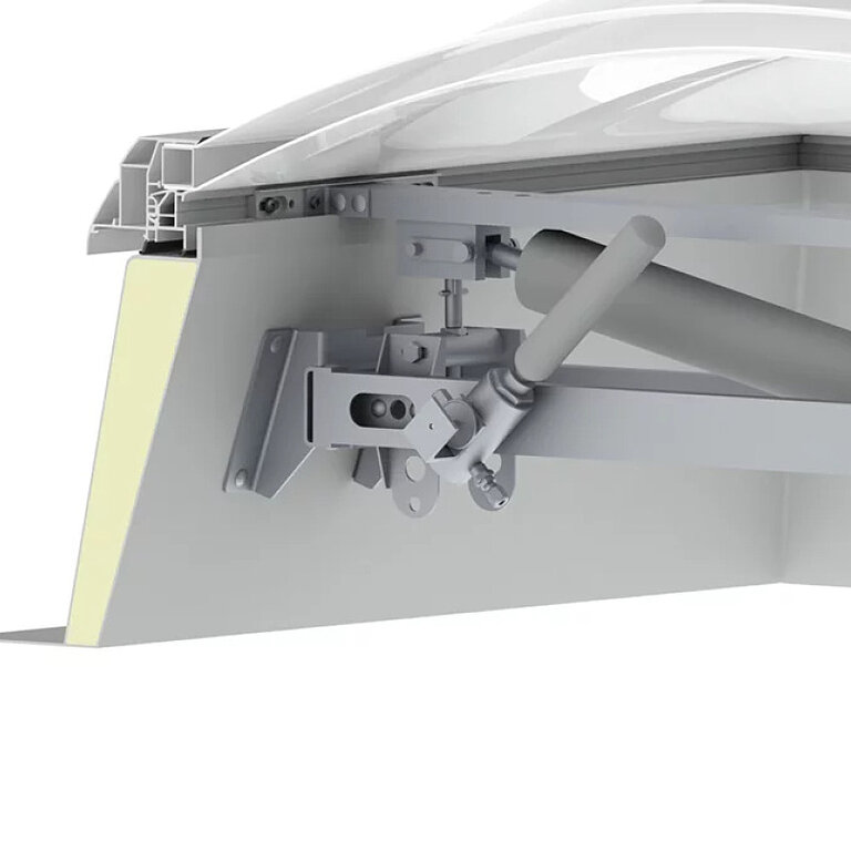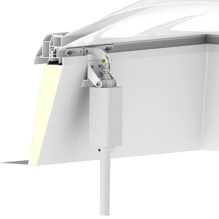 Geometrische Rauchableitung für lüftbare Lichtkuppeln mit RWA-Steuerzentrale, Notstromversorgung, zwei RWA-Tastern, einem Lüftertaster und Spindelmotor (24 V, 500 mm Hub)