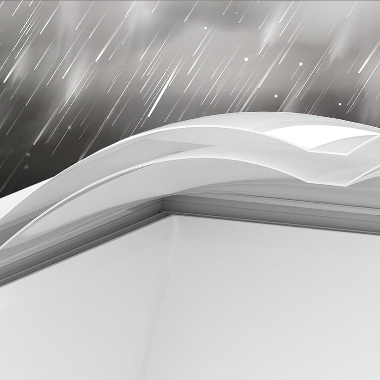 Die LAMILUX Lichtkuppel F100 W wurde speziell für extreme Belastungen entwickelt und setzt neue Maßstäbe in Sachen Stabilität. Durch ihre innovative, wellenförmige Geometrie verteilt sie Lasten optimal und hält selbst enormen Windgeschwindigkeiten, schweren Schneemengen und starkem Hagelschlag zuverlässig stand. Egal ob Hagelkörner bis zu 5 cm oder Orkanböen bis 115 km/h – die Lichtkuppel hält jedem Wetter stand. Über 50 Größen, verschiedene Verglasungsvarianten und Ausführungen bis zur RWA-Anlage machen die LAMILUX Lichtkuppel zur flexiblen Lösung für jedes Industriedach. Dank universeller Adapterrahmen lässt sich das Oberlicht auch im Sanierungsfall individuell an die Bauanforderungen anpassen. So sorgt die Lichtkuppel F100 W für Sicherheit in jedem Ernstfall und spendet täglich Licht und frische Luft.