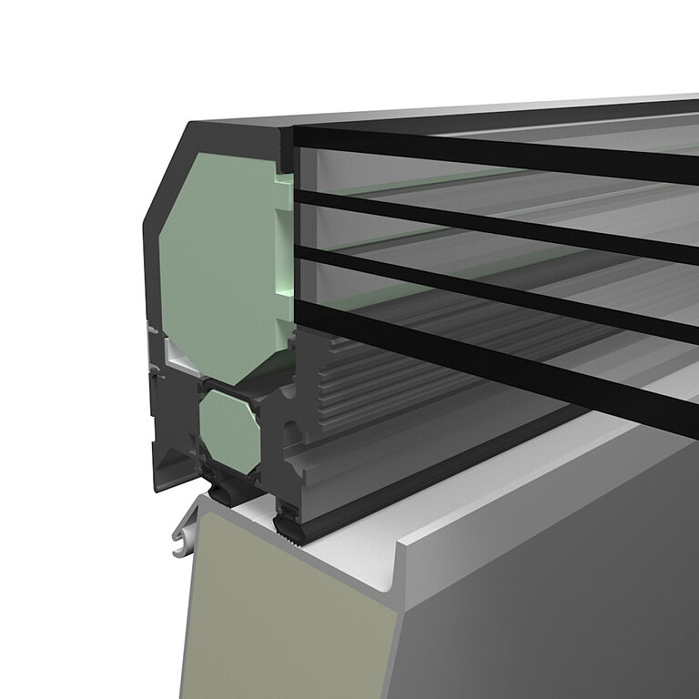 Der Sonnenschutz ist wahlweise innenliegend mit Sicherheitszugbändern, außenliegend als Rollo oder als starre Variante mit Laubbaumeffekt erhältlich. Optional ist auch eine Ausführung mit integriertem Solarmodul möglich.
